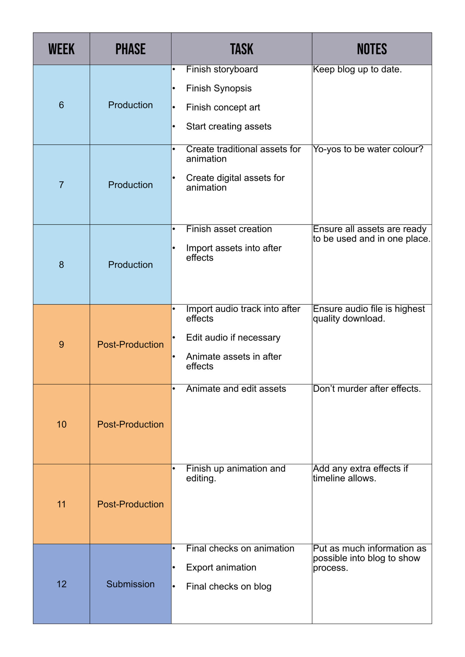 A production plan outlines the timeline of the production of a product. It gives an indication of when different stages are to be completed and allows for deadlines to be set for different millstones. This is a clear way to keep production on schedule and visually show how much time each stage has been allocated.