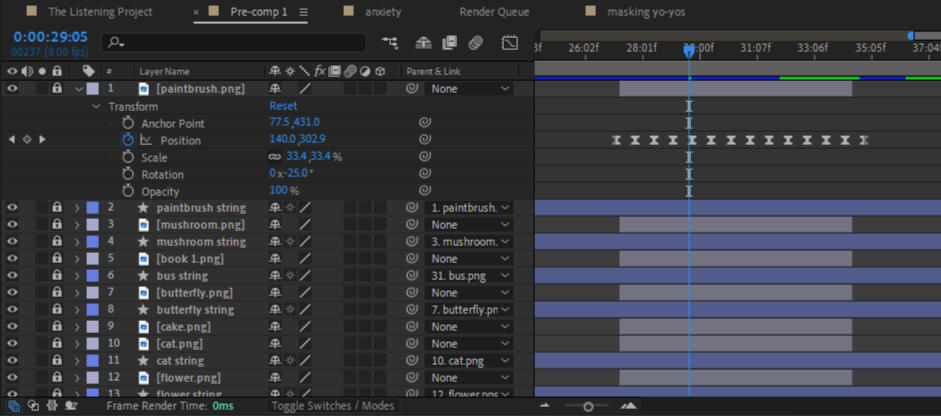 For four of the yo-yos, the ones representing neurotypical people, I used a pre-composition to keep them organised together. I keyframed the position to create the bounce and used ease and out to make the bounce feel more real. I then parented the strings to the yo-yos, so they moved together. It was a similar process, creating the yo-yo that was masking as the motion was the same, it just needed to be offset by a few frames to make it out of sync with the other 4.