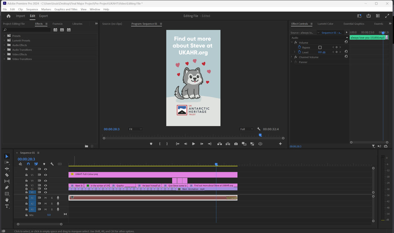 I experimented with sounds in other places, but they always seemed to loud, harsh and out of place even, by the time they were soft enough to fit in with the dialogue they were nearly inaudible which took away from the experience.Despite going through this process, I prefer the animation without any sound effects or music. I feel allowing the aniamtion to speak for itself is better and stop attention being drawn away from the spoken dialogue.