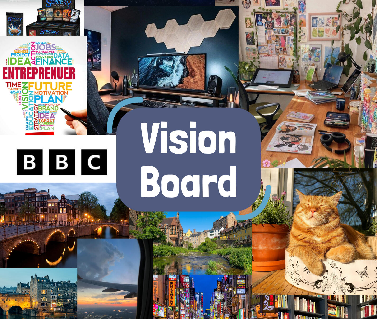 I created a mood board of what I wanted my future to look like. This included both my career goals and personal life goals.For my career, I would like to work mostly from home in a freelance or work from anywhere style because I would like to be able to travel more and this would give me the opportunity to extend my travels to work from different places. It would also be amazing to run my major project, Tickets to Connection, as a business. The goal would be to have it sustain itself financially but not to make loads of money as I want it to benefit as many people as possible, not be locked behind a paywall.There are many places I would like to visit across Europe including, Edinburgh, Amsterdam, and Florence. I would also like to visit Tokyo one day as well as New York.The short term plan is to move to Derby where my partner is to attend a master programme there, but after I am unsure of where I would end up living. I would like to have a home big enough to have a workspace and art studio, so I have a place to separate work from the rest of my life but also the ability to pursue other creative areas I enjoy. This would also have a library nook and no home would be complete without a cat which I plan to name chicken nugget.Although I wouldn’t want to ruin the show for myself, at some point it would be amazing to work to get to work on something for BBC Doctor Who. It has been my favourite show since it returned in 2005
